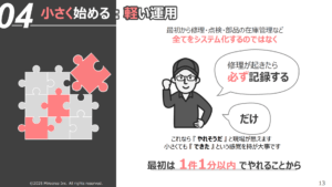 まずは「スマホで写真を撮るだけ」のような、誰でもできる軽い運用から始めることが重要です。