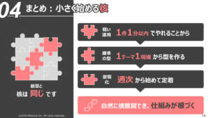 属人化を防ぐためには、「誰がやっても同じ結果になる」仕組みが必要です。
