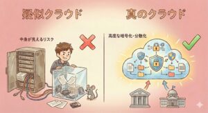 「クラウドでの漏洩」というニュースの背景を正しく理解することは、これからの経営において極めて重要です。ここで明確に区別しなければならないのが、世界的な基準を満たした「グローバルレベルの真のクラウド」と、単にサーバーを外に置いただけの「疑似クラウド」の違いです。