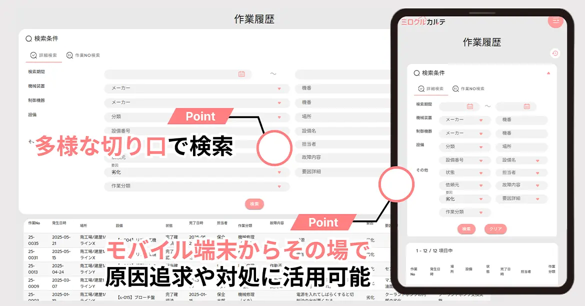 スマホ・タブレットからも利用でき、現場対応中にその場で原因追求や対処に活かせます。