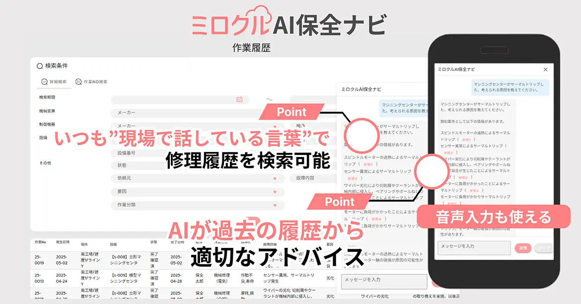 チャット型AIアシスタント「ミロクルAI保全ナビ」の具体的な機能と事例に基づいたデモを公開いたします。