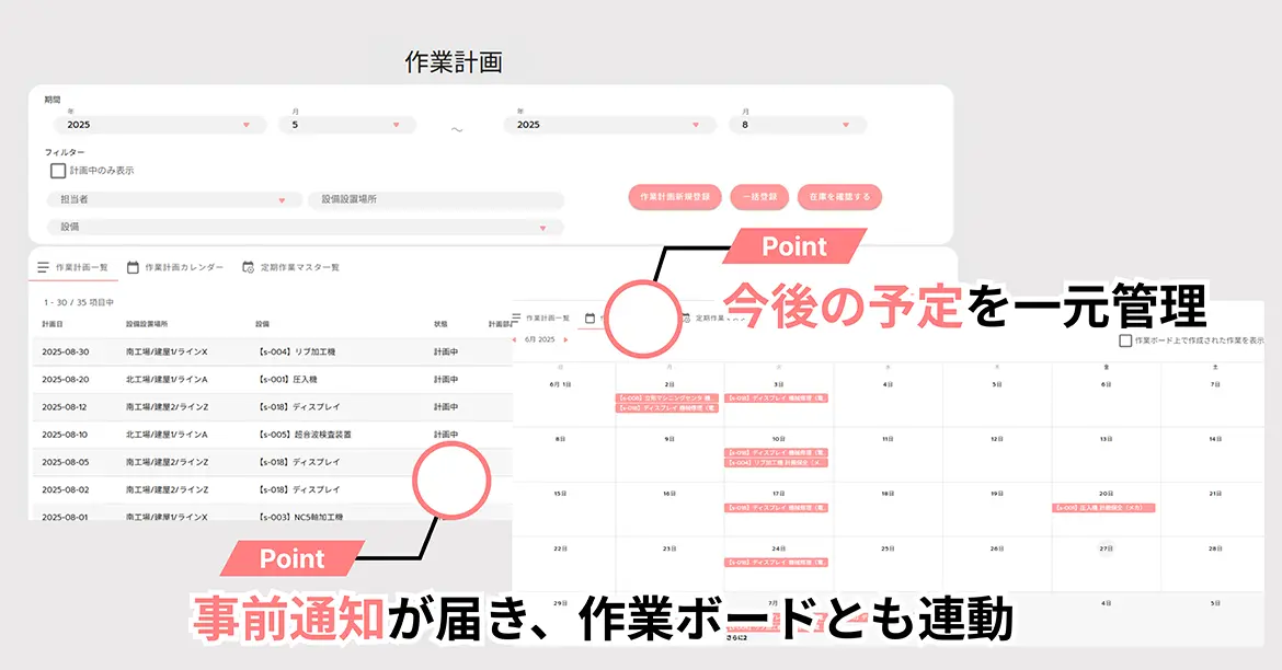 定期交換や補修作業など、今後の予定を一元管理できます。