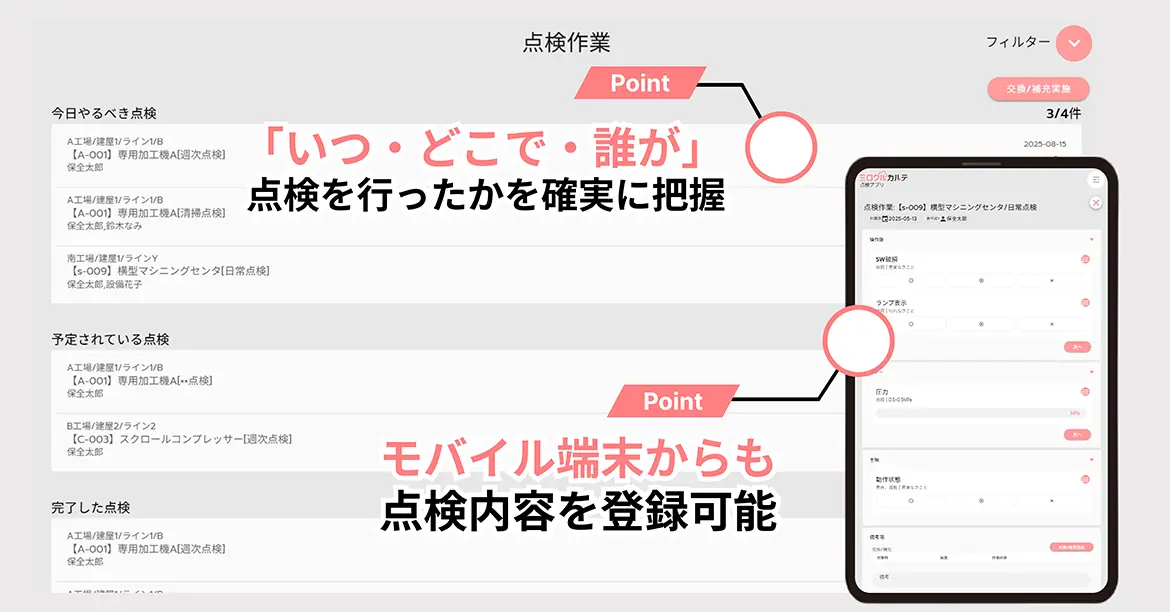 「いつ・どこで・誰が」点検を行ったかを確実に把握し、記録に残せます。